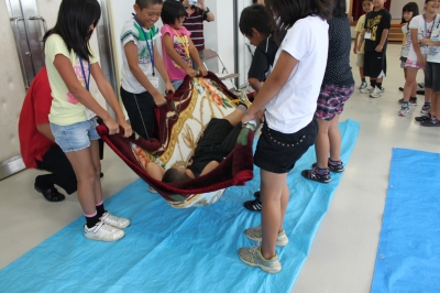 皆で楽しく防災体験(毛布で担架づくり)